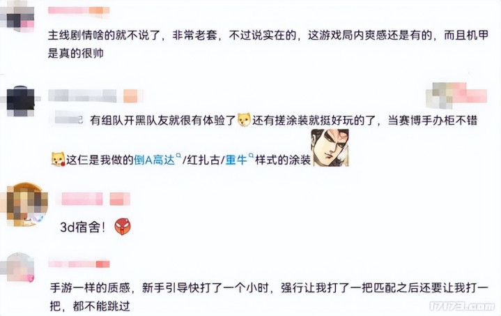 有网友表示,主线剧情啥的就不说了,非常老套,不过说实在的,这游戏局内爽感还是有的,而且机甲是真的很帅。还有网友表示,搓涂装就挺好玩的了,当赛博手办柜不错。然后展示了自己手搓的倒A高达,红扎古,重牛样式的涂装。还有网友因为游戏建模太性感就直言这是《3D宿舍》!
