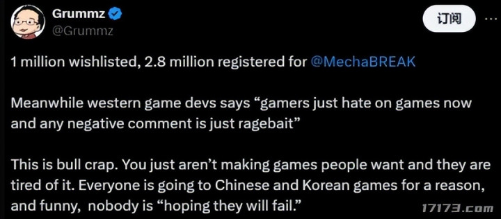 当时前暴雪制作人Grummz也对游戏赞不绝口,还顺便吐槽欧美游戏开发者只知道吐槽玩家不行。